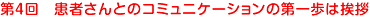 挨拶には「あなたの存在に気づいています」、「よろしくお願いします」などの前向きなメッセージが含まれていています。 挨拶は、相手と心理的な結びつきを持ち・より良い人間関係を作るために、重要な役割を持っています。つまり、挨拶は、患者さんとあなたのコミュニケーションの第一歩なのです。