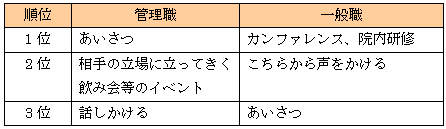 「スタッフ同士のコミュニケーションを良くするためには」という問いの順位は、以下の通りでした。